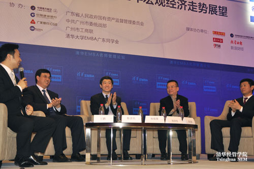 在主题对话中,李稻葵还与清华EMBA校友、中国建设银行广东省分行行长靳彦民,清华EMBA校友、南航股份公司执行董事副总经理徐杰波,广州尚东集团董事长郭泽伟等探讨了珠三角企业家在此背景下如何适时调整发展战略、房地产企业的下一步发展等问题。