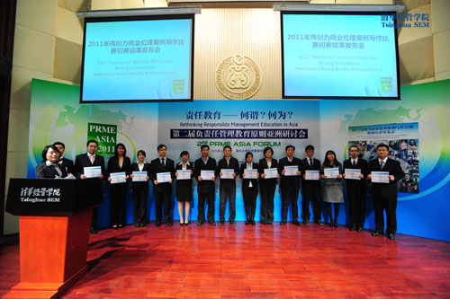 在下午的负责任教育成果展示环节,清华经管学院的本科生展示了他们在暑期实践中的所思所得,清华经管学院MBA学生也为大家展示了他们学习实践中的收获。2011年伟创力商业伦理案例写作比赛中期展示暨初赛结果发布会顺利召开。发布会尾声,优秀案例获奖队员共同上台,完成由所有参赛队员照片组成的拼图,象征着中国商学院同学,将共同践行自己的社会责任誓言,为推动改善中国商业伦理环境并肩前行。