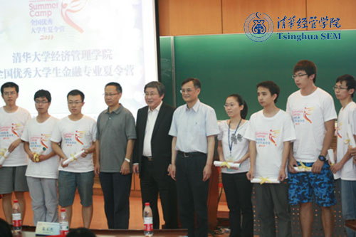 在结营仪式上,金融系宋逢明教授结合自己多年的教研和实务经历,讲述了中国国有商业银行改革的经历。他生动有趣的讲解不时激起在座大学生们的笑声和掌声。 清华经管学院校友、中国人民银行研究局张健华局长从央行的视角,为学生们剖析了我国十二五规划中的金融战略。然后,宋教授与张学长就银行经营的微观审慎与银行业宏观风险的互动关系进行高端对话。随着对话进入高潮,两位主讲人与学生们探讨了许多现场提出的重要话题。结营仪式在同学们意犹未尽的讨论声中圆满落幕。