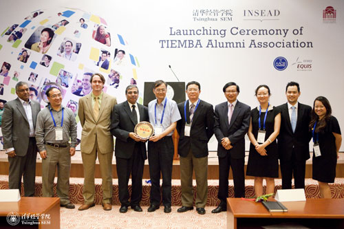 当清华经管学院院长钱颖一教授和来自INSEAD商学院的院长 Dipak C. Jain教授的手同时触摸到水晶球的时候,屋子里200多名来自世界各国的学生的目光一同投向水晶球里面荧光蓝的英文:TIEMBA Alumni Association(TIEMBA校友协会)。主持人TIEMBA 2011级校友Lisa Djeng告诉大家,水晶球代表了TIEMBA项目全球化蓝图中的累累硕果。