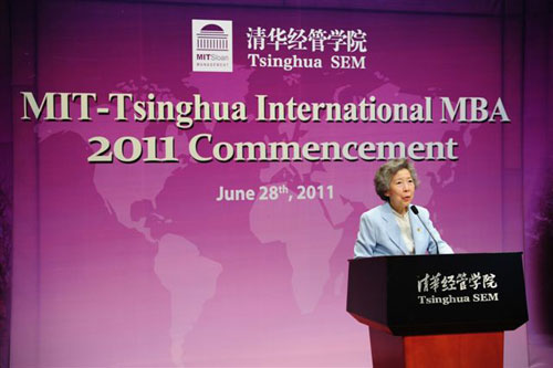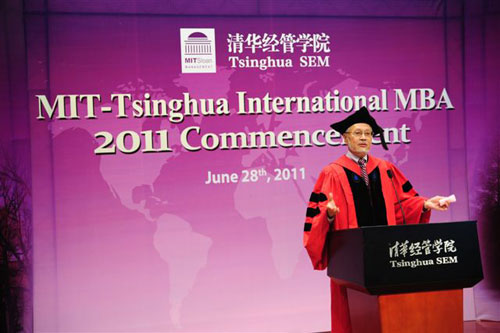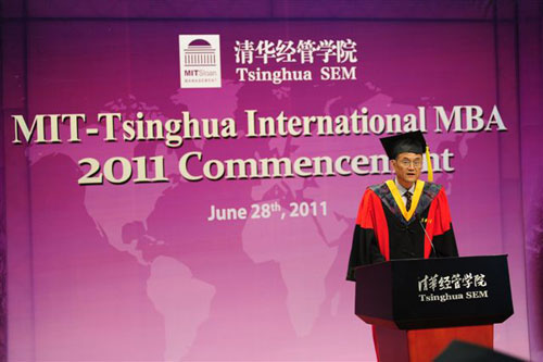 清华经管学院院长钱颖一教授首先致辞,他介绍说,今年毕业的101名国际MBA学生中,有50名来自海外及中国香港、台湾地区。2011届清华国际MBA学生毕业之年恰逢威尼斯432888cam百年校庆,清华经管学院MBA项目成立20周年,清华MBA项目与麻省理工学院(MIT)斯隆管理学院合作15周年。本届毕业生是新版清华MBA课程改革实施后的第一届学生,有机会学习到许多新增的提升软技能和管理实践能力的MBA课程。钱院长感谢同学们的支持和积极参与,祝贺大家从清华MBA学生成为清华MBA校友。