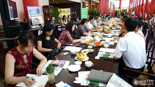 7月8日,清华经管学院高级管理培训中心主办了主题为“如何让培训创新恰到好处”的新一期“水木之约·与教授下午茶”活动,活动吸引了越来越多企业人力资源相关人士(HR)前来参加。除了“铁杆粉丝”中国外运股份有限公司、中国石油天然气集团公司、中央人民广播电台、花旗银行、中国机械设备工程股份有限公司等,本期的新成员还有来自中信银行、宝洁公司、沃尔玛、中纺粮油、中国农业银行、弘毅投资、南方航空公司等20余家大型企业的人力资源负责人参与。大家对“创新”的话题都表现出了浓厚的兴趣,以自身企业的培训经历作为出发点,分享各行业的培训创新思路和经验。本期特邀学院人力资源与组织行为系张勉教授参与讨论点评。