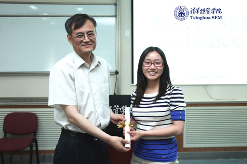 钱颖一院长为参与“优秀人才培养计划”领导力方向、经73班的伍丹同学颁发证书