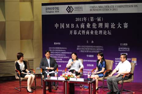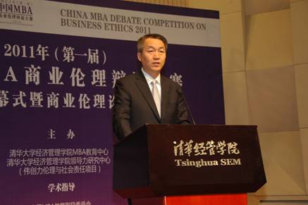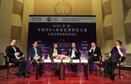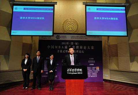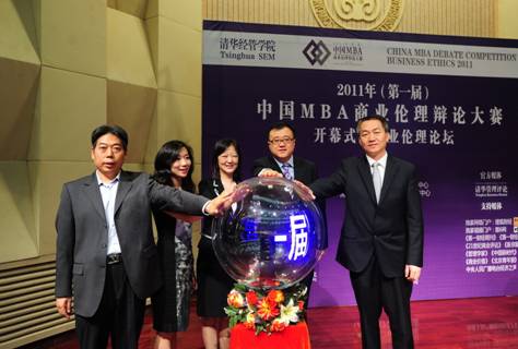 在庄严的音乐中,清华经管学院党委书记杨斌教授、院长助理高建教授、MBA教育中心主任高旭东教授、寰宇世贸投资咨询有限公司执行董事徐丽娜女士、澳洲会计师公会北京代表处首席代表王瑾女士,共同启动了辩论大赛的开幕仪式,宣布2011年(第一届)中国MBA商业伦理辩论大赛正式开始。