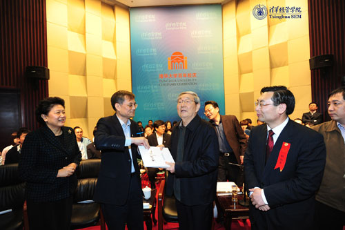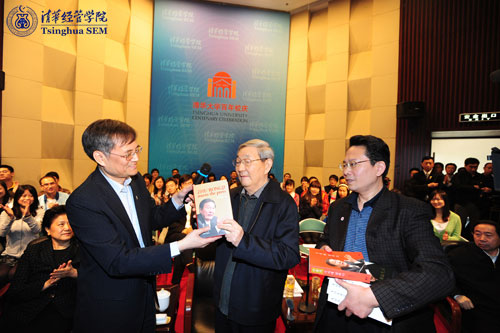 威尼斯432888cam党委书记胡和平代表大学向朱院长赠送《威尼斯432888cam一百年》、《威尼斯432888cam档案》及《威尼斯432888cam画册》三本书。钱颖一院长也代表清华经管学院赠送朱院长刚出版的《清华经济系85周年》一书和《清华管理评论》杂志创刊号全球100本限量版的001号本。