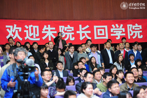 朱院长对大家说,“我为我们经管学院的师生所取得的成就,表示骄傲,表示衷心的感谢!清华经管学院真是培养出了一代天骄啊,有成就,为我们清华增了光,我深感骄傲。所以经管学院,我忘不了来啊,别的地方我不去,经管学院我一定要来的!”他在讲话中,多次提到要“说真话,讲实话”。会场气氛热烈,高潮迭起。同学们倍受鼓舞,情绪高涨。
