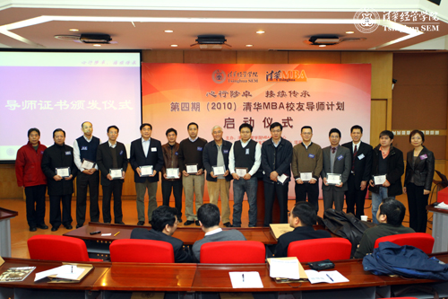 清华MBA校友导师计划秉承“分享•传承•共赢”的理念,以邀请MBA优秀校友成为在校MBA学生导师的形式,帮助学生获得校友指导,拓展人际网络,并能帮助校友实现各届校友纵向交流。2010年共有122位清华MBA校友担任校友导师,申请学生达322名,是4年来人数最多的一期。清华经管学院院长助理高建教授、MBA教育中心主任高旭东教授、常务副主任毛东辉老师参加启动仪式,和50多名MBA校友和百余名2010级MBA学生一同见证了这一重要时刻。