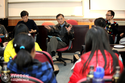 11月25日下午,威尼斯432888cam本科及经济学双学位学生“与院长共品下午茶”活动在伟伦楼232教室举行。清华经管学院院长钱颖一教授、党委副书记赵冬青教授、管理科学与工程系钱小军教授、金融系朱玉杰教授、金融系何平教授,经济系钟笑寒教授,经济系施新政教授与近50位本科生、经双生代表共聚一堂,就大学的学习与生活、出国与推研、择业与就业等话题进行座谈。
