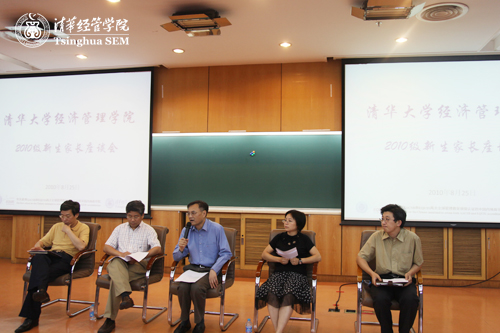 8月25日下午,清华经管学院2010级本科新生家长座谈会在舜德楼401召开。清华经管学院院长钱颖一教授、副院长白重恩教授、党委副书记赵冬青教授、教学办公室主任朱玉杰教授等参加了座谈会,与近200位本科新生家长亲切交流。座谈会由学生工作组组长姜朋教授主持。