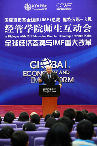 11月16日晚,一场别开生面的交流互动会在清华经管学院伟伦楼国际报告厅举行,国际货币基金组织(IMF)总裁多米尼克·施特劳斯-卡恩(Dominique Strauss-Kahn)先生作为嘉宾,为清华经管学院师生带来了题为“全球经济态势与IMF重大改革”的精彩演讲,并与师生们进行了长达一个多小时的互动。