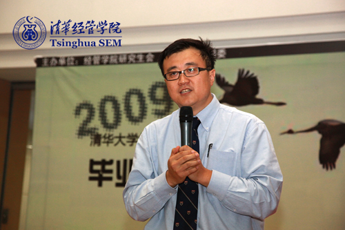 杨斌老师发表了热情洋溢的讲话,他勉励在座毕业生要谦虚谨慎、戒骄戒躁、胸怀理想、坚韧不拔,做一个无愧清华经管称号的毕业生。白重恩老师在致辞中幽默地说,他经历了24年半的读书生涯,所以非常理解大家此时的心情,他祝贺大家“终于”毕业了。他还希望同学们记住,学院有他们的师长、同窗和兄弟姐妹,这里永远是他们的坚强后盾。吴栋老师和李子奈老师也分别在发言中向毕业生们表示了祝贺。