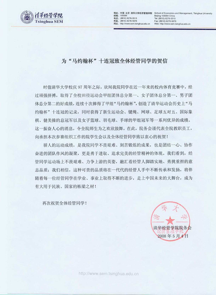院务会为"马约翰杯"十连冠致全体经管同学的贺信