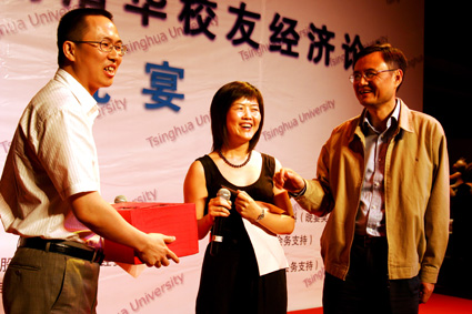 (清华经管学院院长钱颖一[右一]为晚会抽奖)